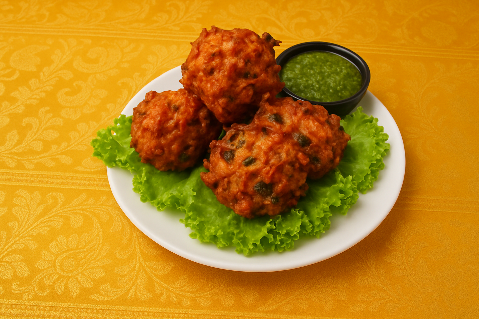 מיקס ירקות גזר,תפוח אדמה, בצל, כוסברה, קישוא בבלילת קמח עדשים ותערובת תבלינים ביתית בטיגון עמוק.